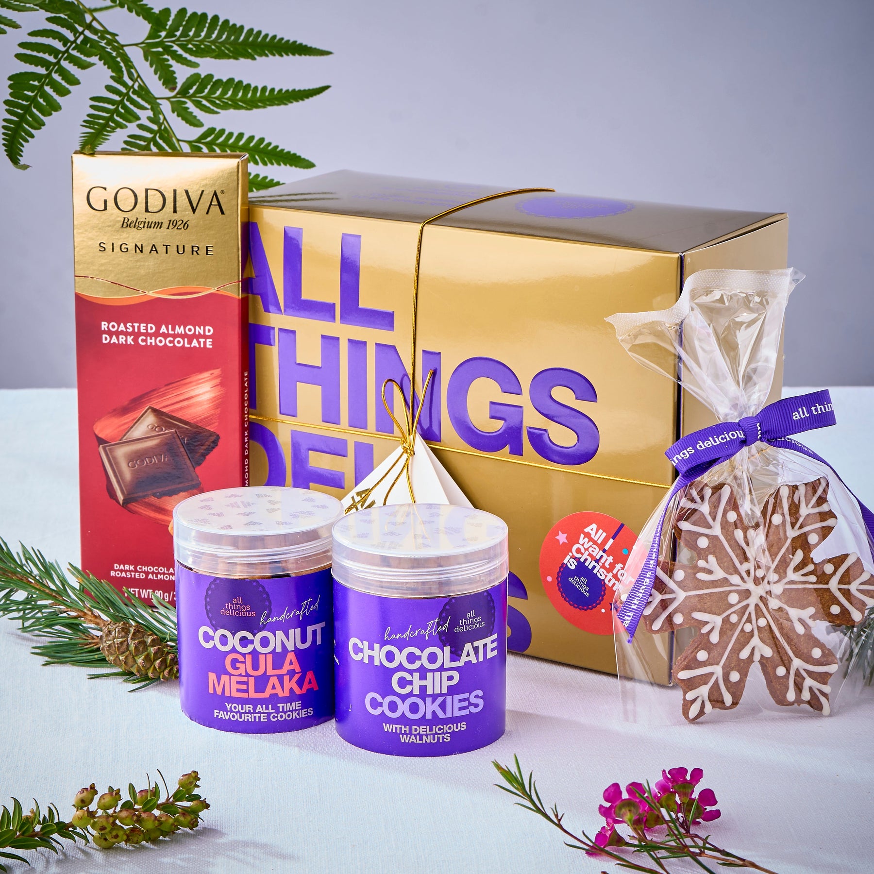 Send a beautiful All Things Delicious gift box to brighten someone's day this Christmas! Each Yuletide Gift Box contains 2 mini jars of cookies, a box of artisanal Sweet Caramels or nougat and a gorgeous, hand-made Gingerbread Man cookie, lovingly piped by Santa’s elves right here in the ATD kitchen!